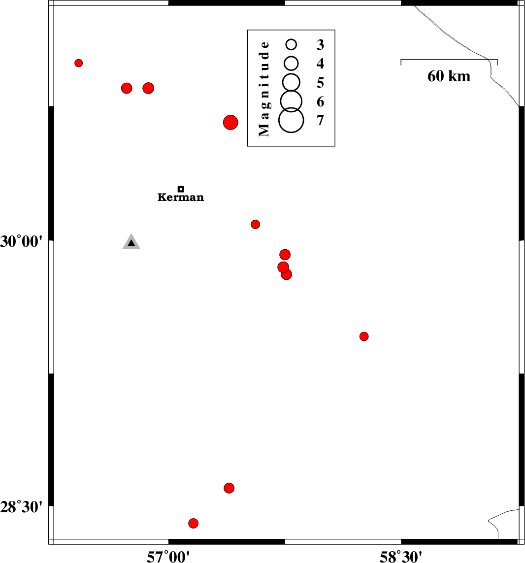 | 2014/02/21 | 11:14:59.6 | 14:44:59.6 | 29.85 | 57.74 | 42 | ML3.2 | Kerman Province, 80 km South-East of Kerman | ||