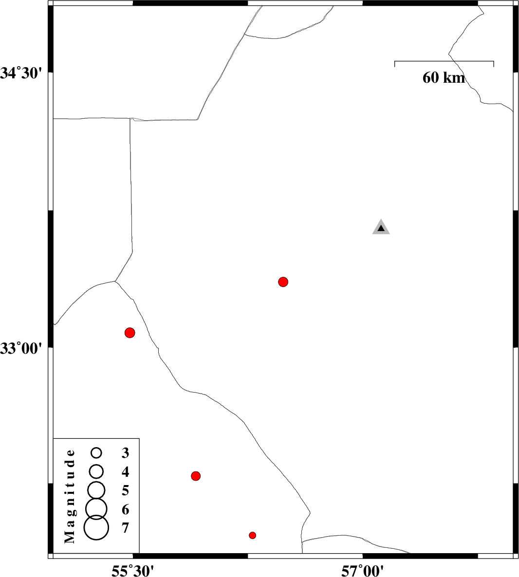 | 2014/02/22 | 12:18:24.9 | 15:48:24.9 | 33.36 | 56.48 | 15 | ML2.8 | Yazd Province, 50 km South-West of Tabas | ||