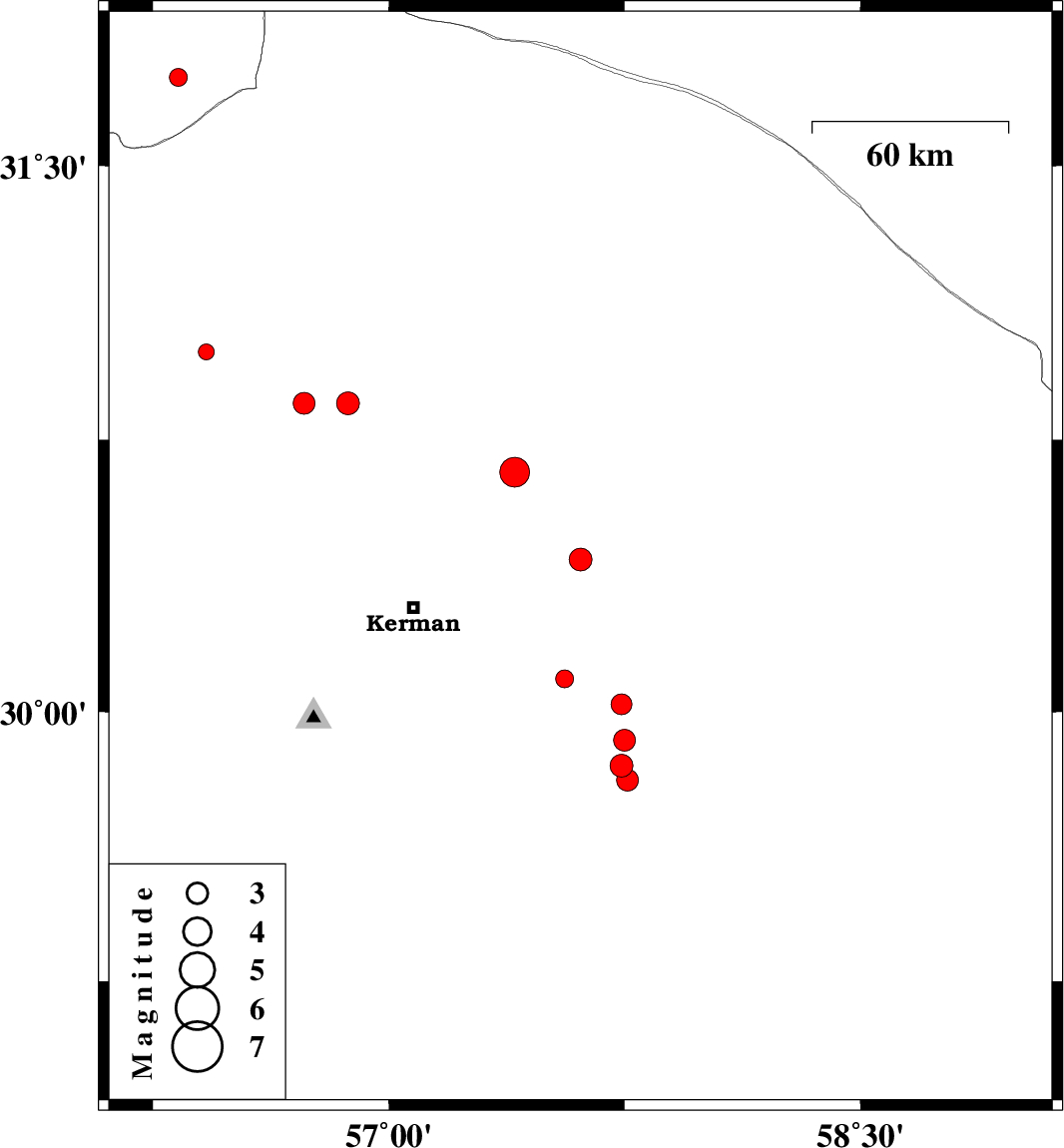 | 2014/02/21 | 11:14:59.6 | 14:44:59.6 | 29.85 | 57.74 | 42 | ML3.2 | Kerman Province, 80 km South-East of Kerman | ||
