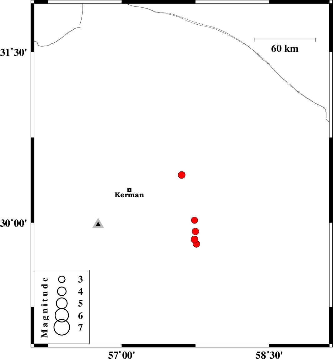 | 2014/02/21 | 11:14:59.6 | 14:44:59.6 | 29.85 | 57.74 | 42 | ML3.2 | Kerman Province, 80 km South-East of Kerman | ||