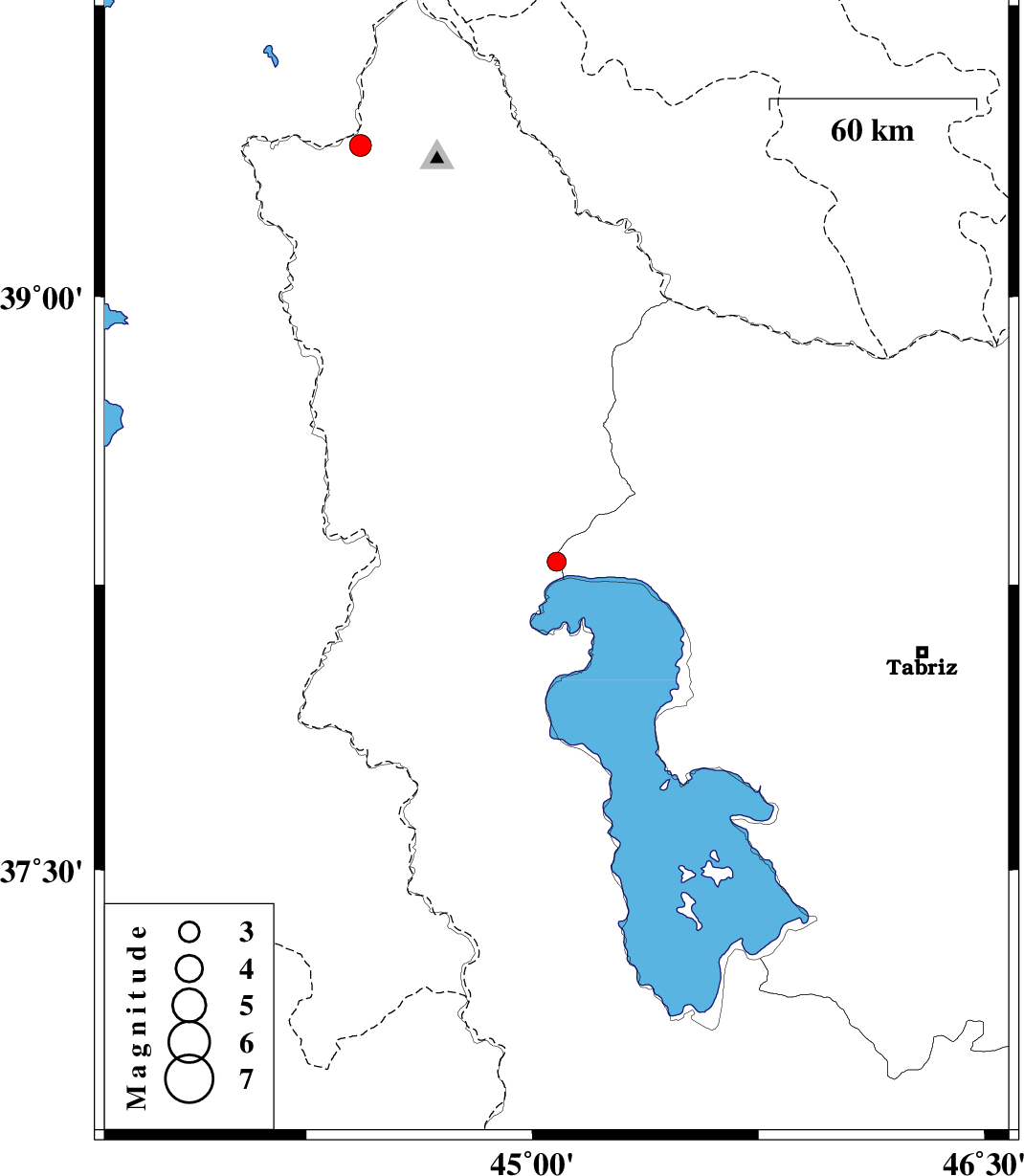 | 2014/02/25 | 17:16:50.3 | 20:46:50.3 | 39.39 | 44.43 | 6 | ML3.2 | Azarbaijan Gharbi Province, 12 km Maku |