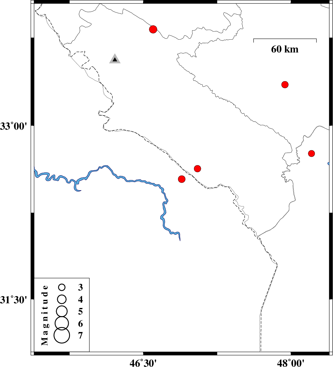 | 2014/03/03 | 22:12:49.2 | 01:42:49.2 | 32.54 | 46.89 | 14 | ML3.2 | Iraq, 39 km South-West of Dehloran | ||