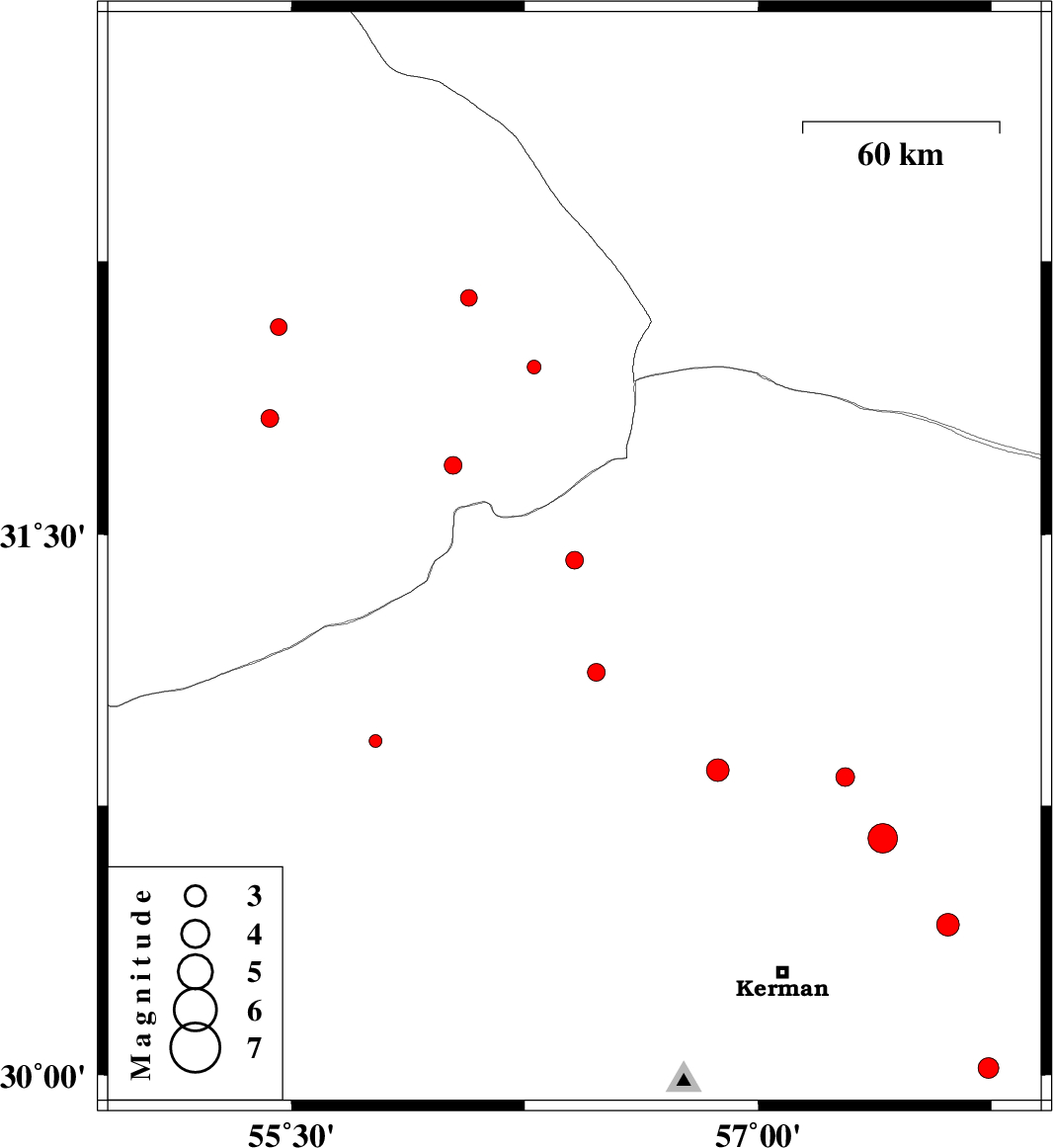 | 2014/03/09 | 05:07:05.0 | 08:37:05.0 | 30.83 | 57.28 | 16 | ML2.7 | Kerman Province, 68 km East of Zarand | ||
