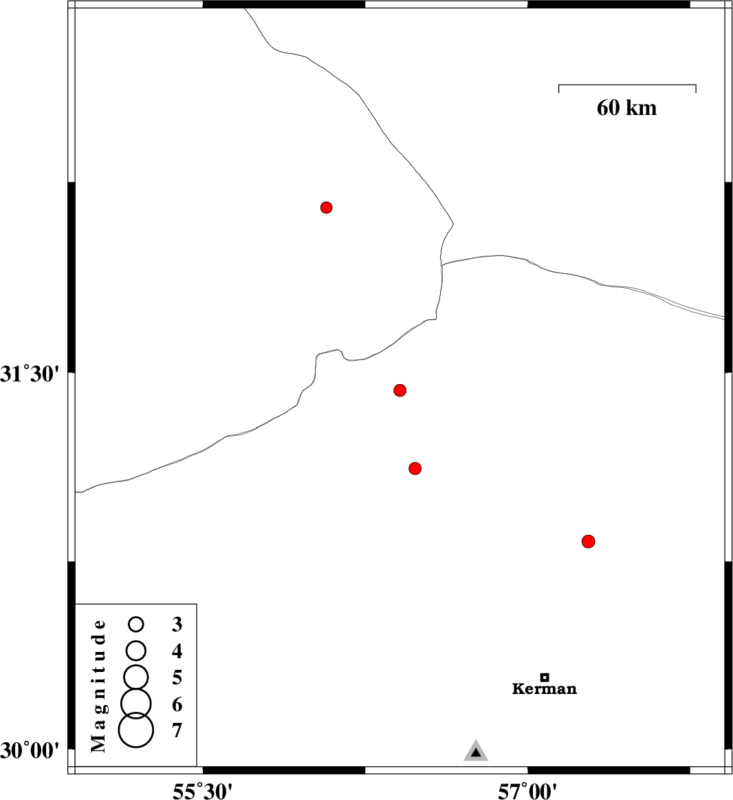 | 2014/03/09 | 05:07:05.0 | 08:37:05.0 | 30.83 | 57.28 | 16 | ML2.7 | Kerman Province, 68 km East of Zarand | ||