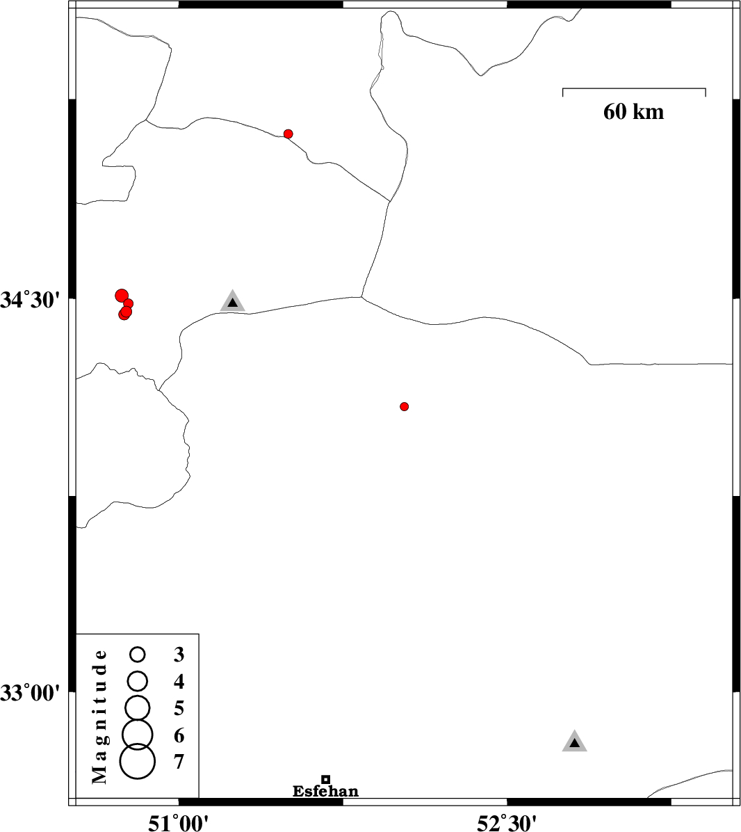 | 2014/03/11 | 21:36:52.7 | 01:06:52.7 | 34.45 | 50.76 | 15 | ML2.3 | Qom Province, 25 km South-West of Qom | ||