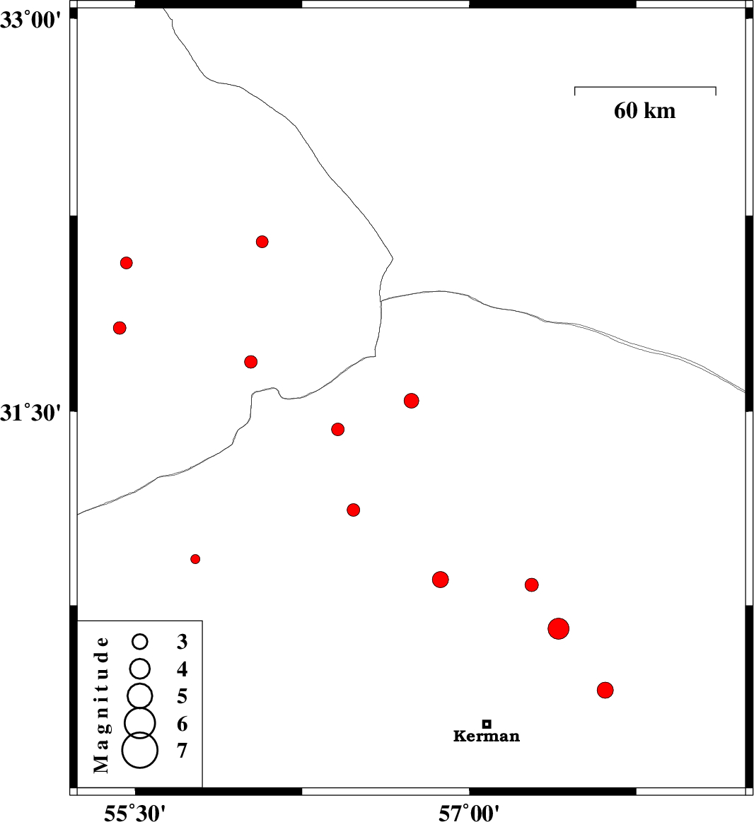 | 2014/02/27 | 14:08:41.7 | 17:38:41.7 | 30.93 | 55.77 | 15 | ML1.9 | Kerman Province, 63 km North-West of Rafsanjan | ||
