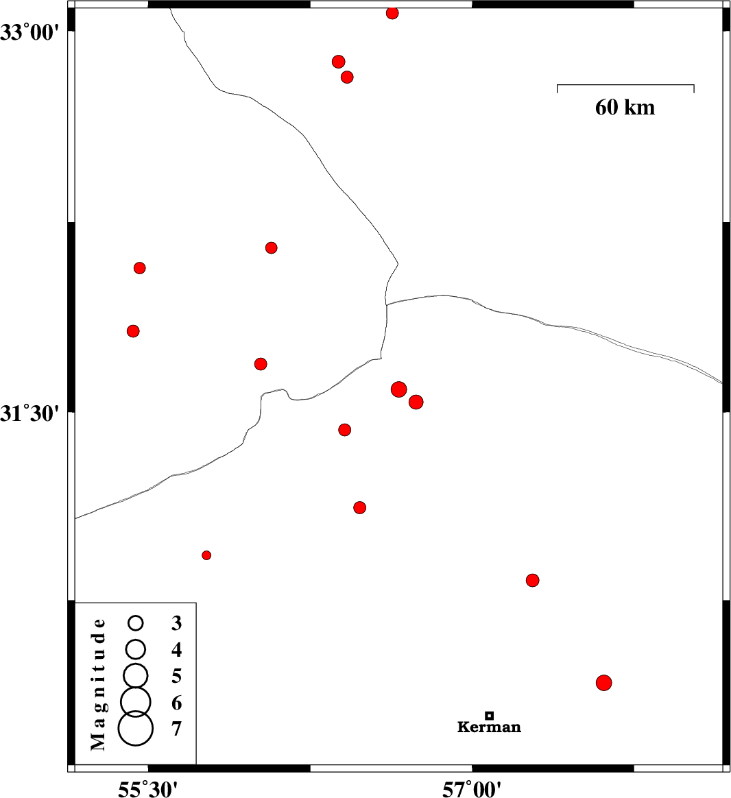 | 2014/03/18 | 01:00:51.5 | 04:30:51.5 | 31.59 | 56.66 | 14 | ML3.2 | Kerman Province, 39 km North-West of Ravar | ||
