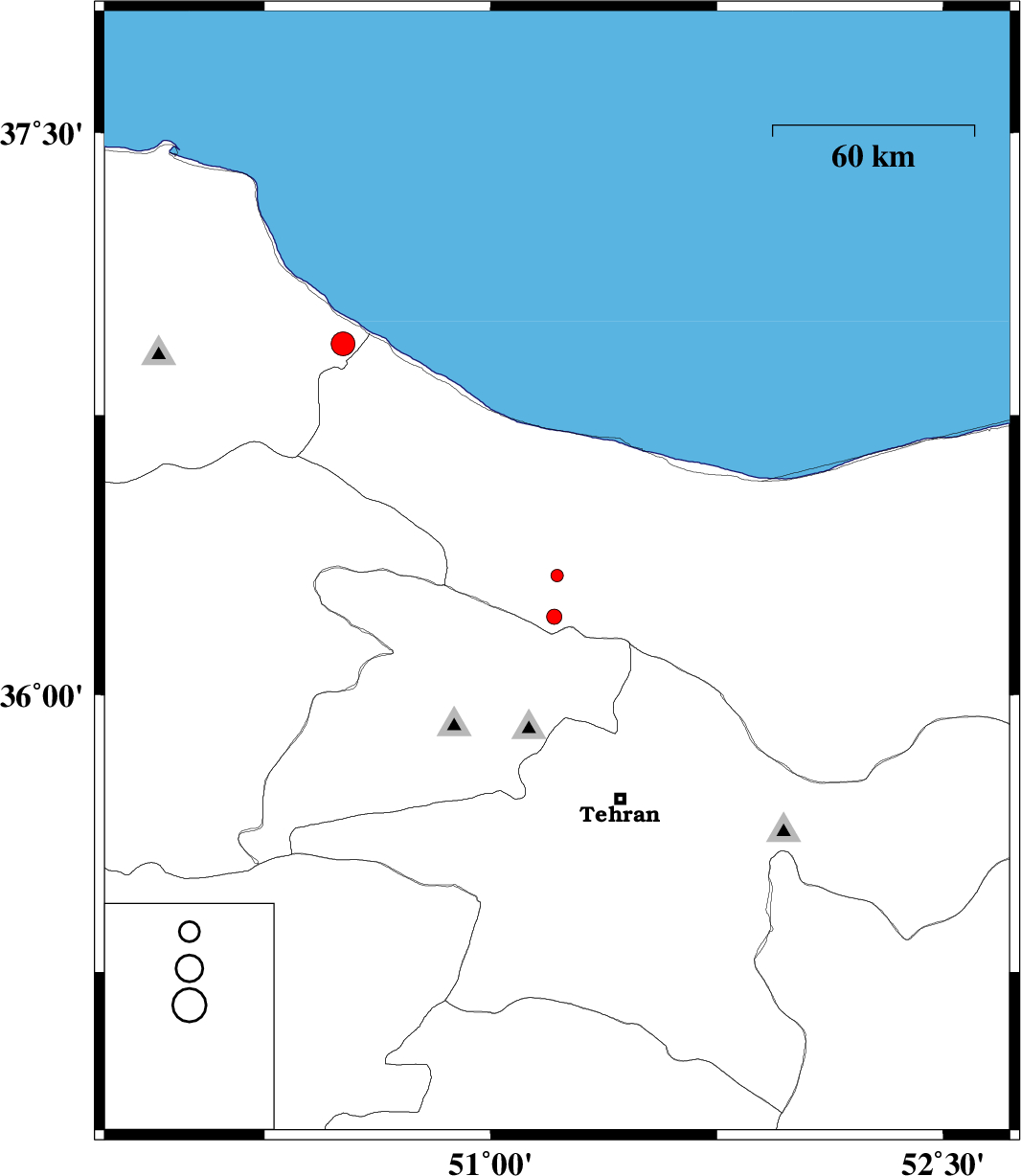 2014/03/22 | 23:37:23.5 | 04:07:23.5 | 36.32 | 51.22 | 14 | ML1.8 | Mazandaran Province, 42 km South-West of Chalus | ||