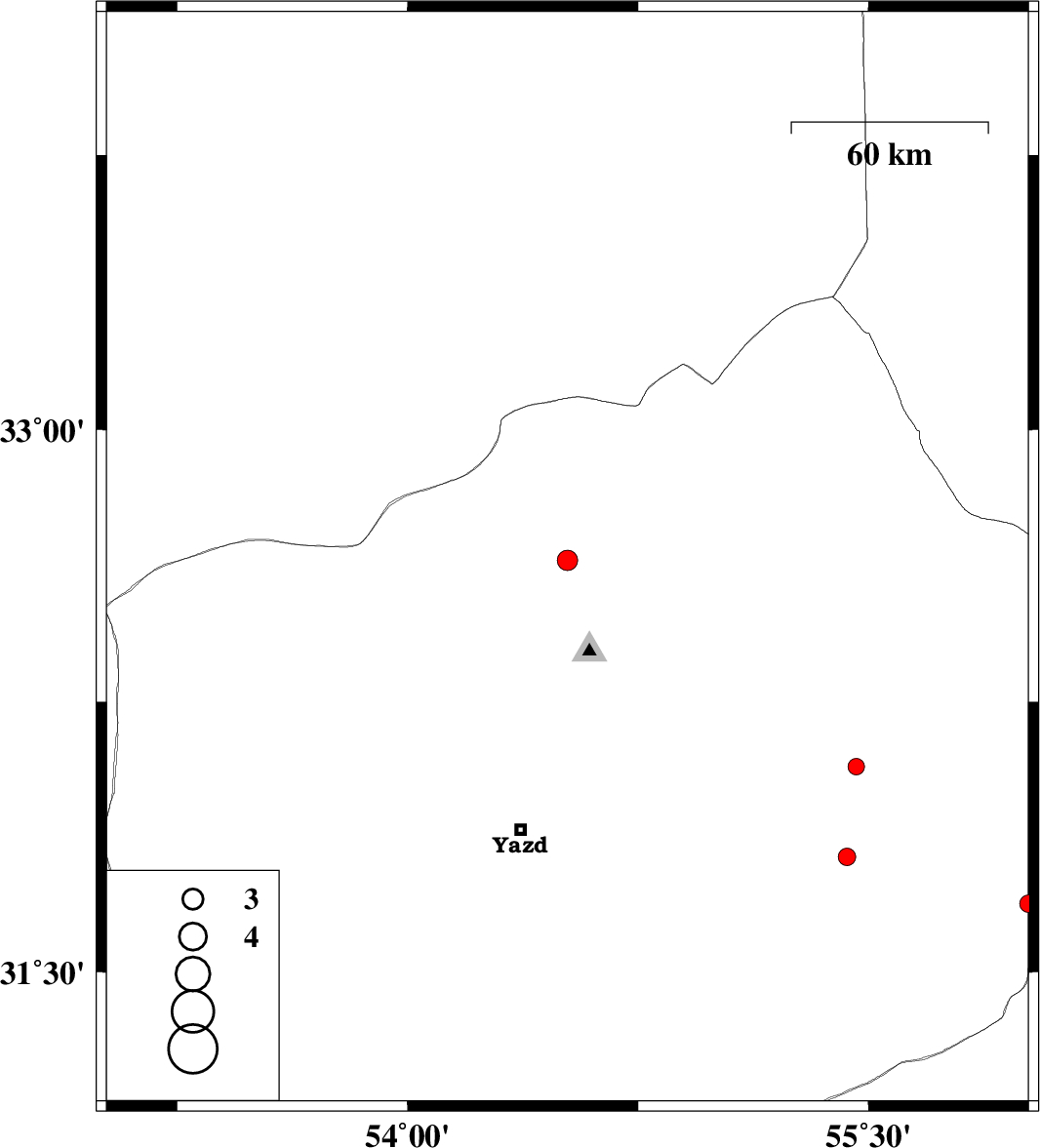 | 2014/02/23 | 13:42:09.7 | 17:12:09.7 | 31.82 | 55.43 | 15 | ML2.5 | Yazd Province, 24 km North of Bafq | ||