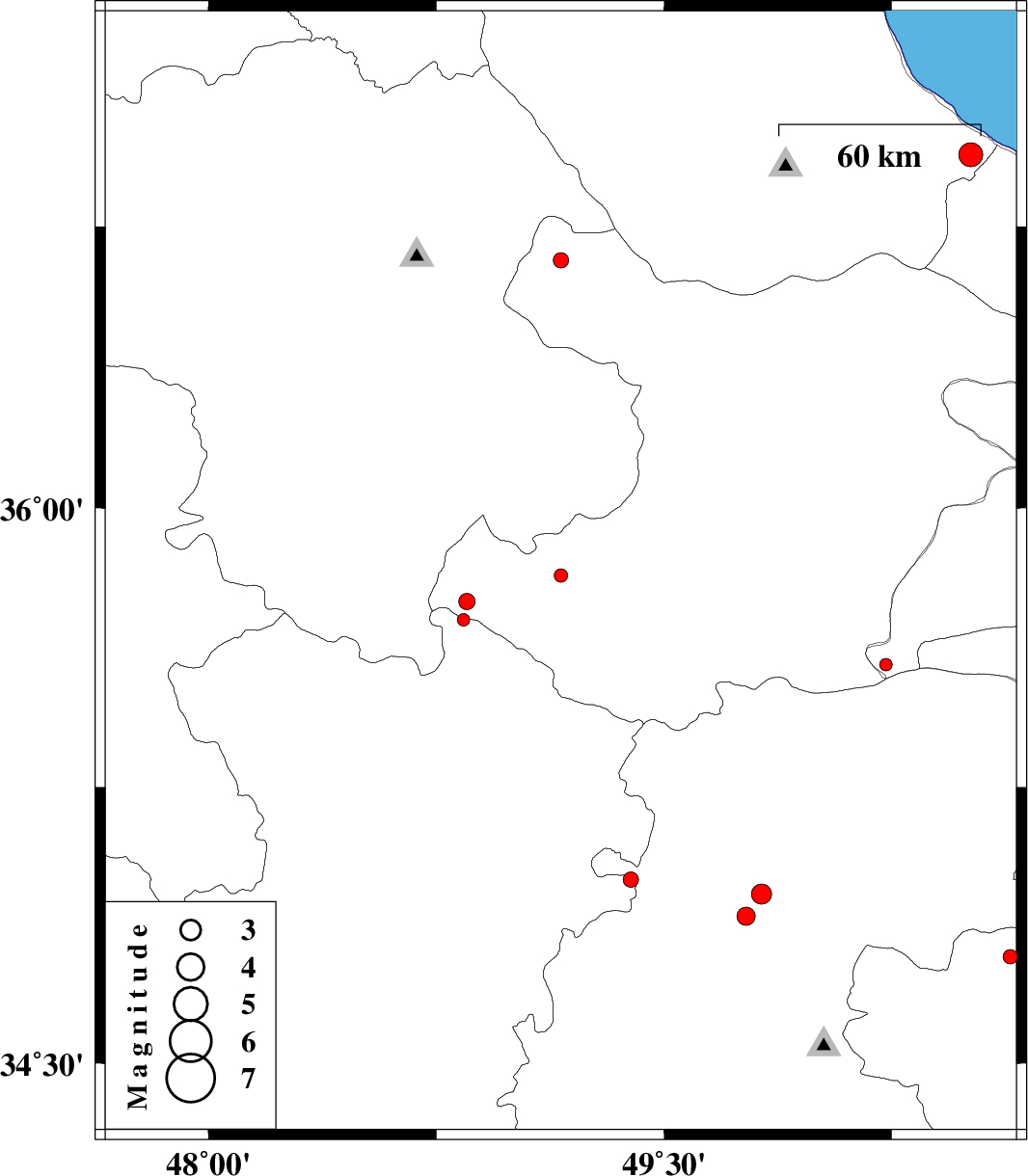 | 2014/03/06 | 01:48:02.4 | 05:18:02.4 | 34.96 | 49.82 | 16 | ML3 | Markazi Province, 35 km North-West of Tafresh | ||
