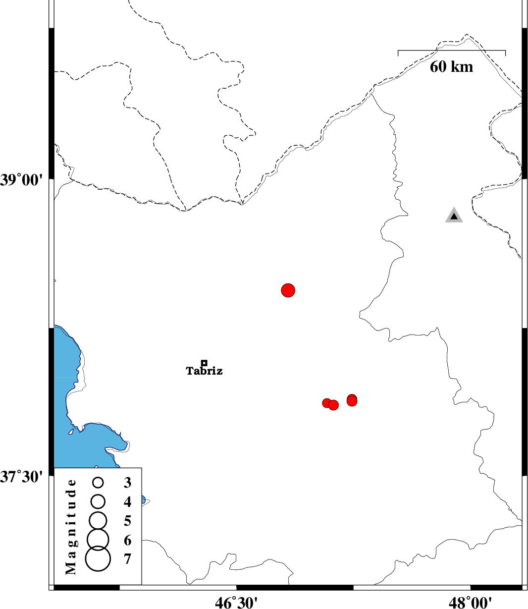 | 2014/03/23 | 07:56:23.8 | 12:26:23.8 | 37.89 | 47.24 | 45 | ML2.8 | Azarbaijan Sharghi Province, 27 km West of Sarab |