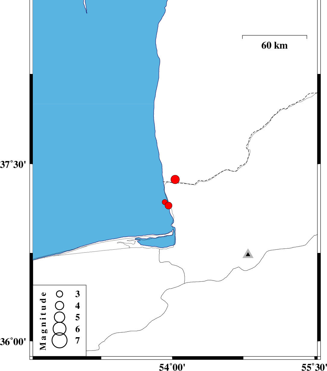 2014/03/24 | 04:11:20.5 | 08:41:20.5 | 37.18 | 53.92 | 15 | ML2.5 | Caspian Sea, 34 km North-West of Bandar-e torkaman |