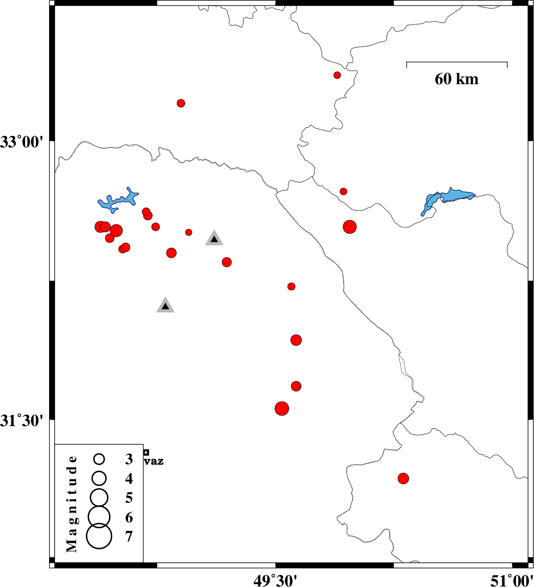 | 2014/03/05 | 02:31:57.3 | 06:01:57.3 | 32.73 | 49.93 | 34 | ML2 | Esfahan Province, 29 km South-West of Fereydunshahr |