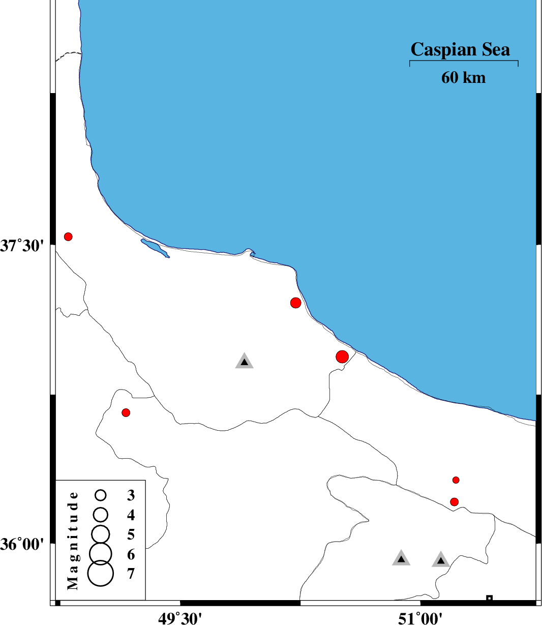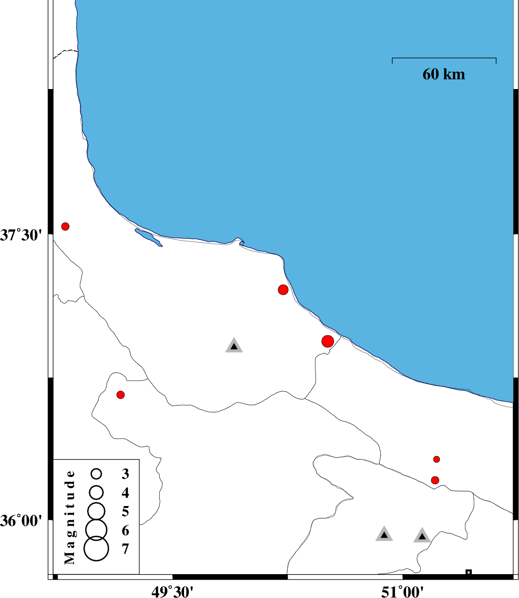| 2014/03/20 | 11:13:22.5 | 14:43:22.5 | 36.94 | 50.51 | 31 | ML3.5 | Gilan Province, 13 km West of Ramsar | ||