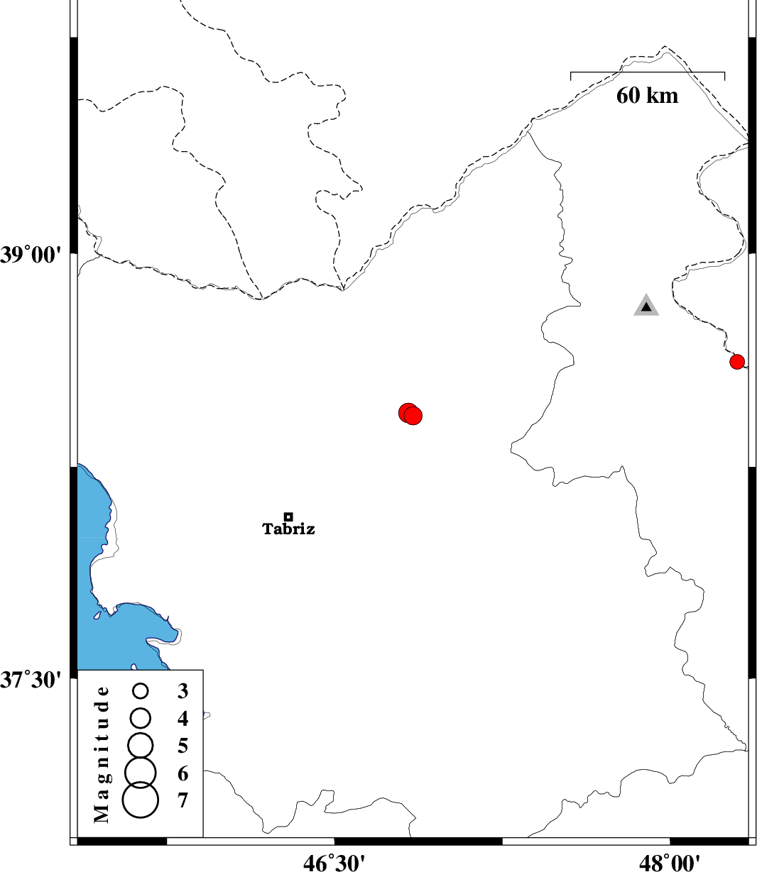 | 2014/03/30 | 10:51:58.7 | 15:21:58.7 | 38.44 | 46.83 | 14 | ML3.9 | Azarbaijan Sharghi Province, 22 km West of Ahar |