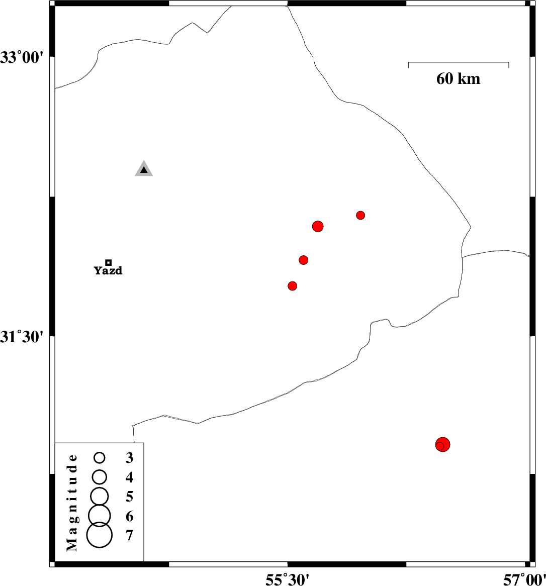 | 2014/03/31 | 21:52:52.0 | 02:22:52.0 | 32.09 | 55.69 | 14 | ML3.1 | Yazd Province, 60 km North-East of Bafq |