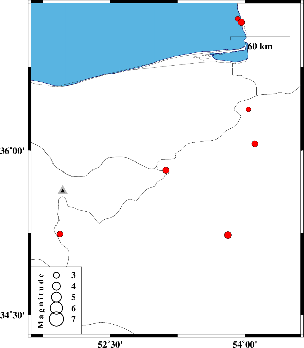 | 2014/03/31 | 11:02:07.3 | 15:32:07.3 | 37.15 | 53.96 | 18 | ML3.4 | Caspian Sea, 29 km North-West of Bandar-e torkaman | ||