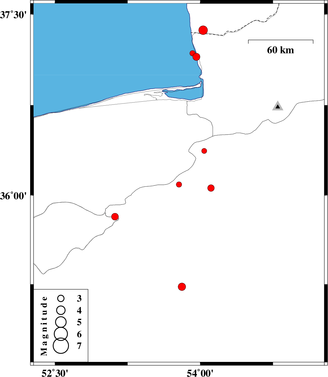 | 2014/03/31 | 11:02:07.3 | 15:32:07.3 | 37.15 | 53.96 | 18 | ML3.4 | Caspian Sea, 29 km North-West of Bandar-e torkaman | ||