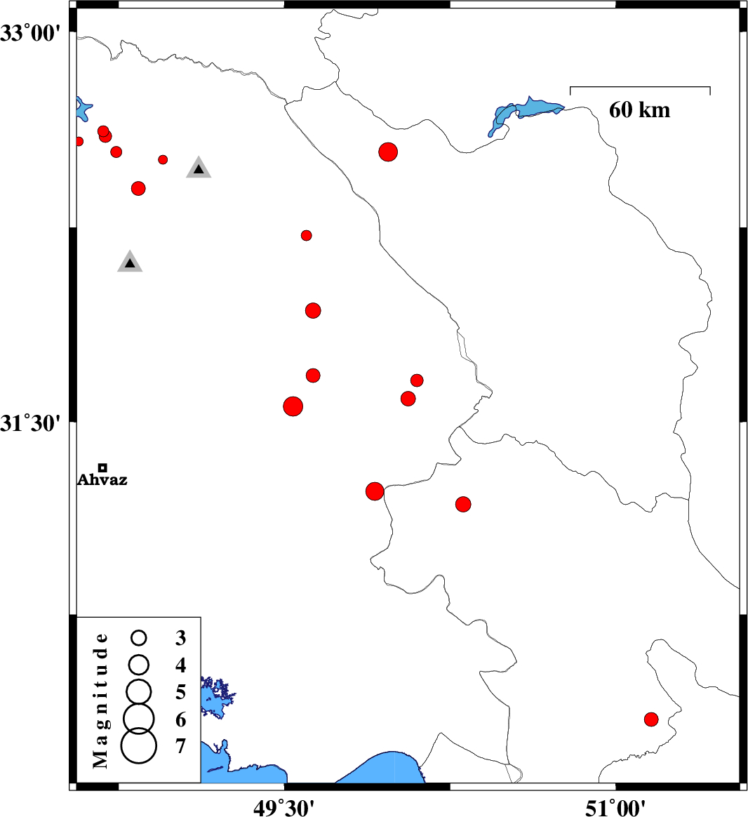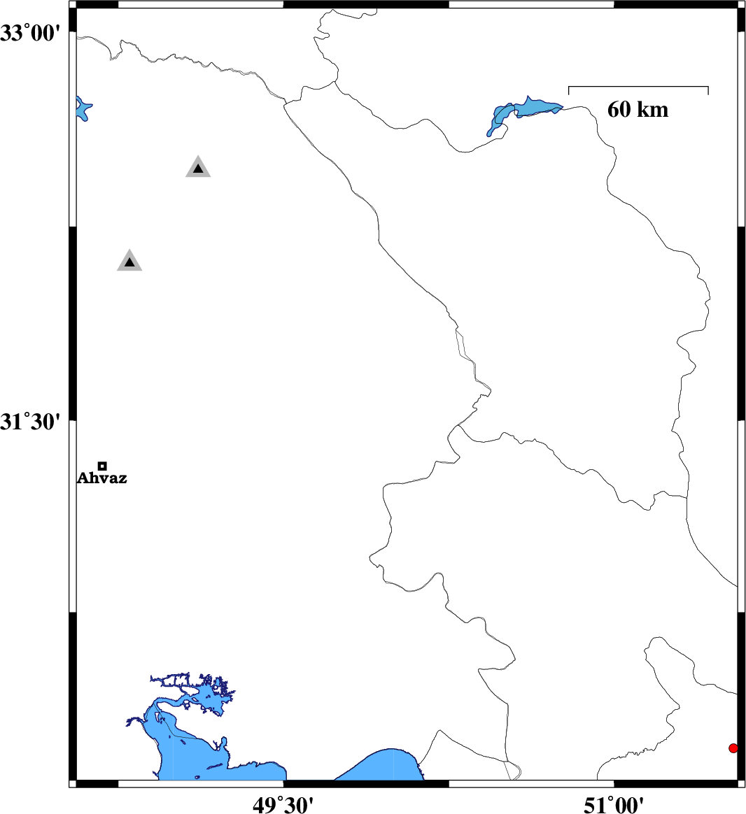 | 2014/03/29 | 21:52:09.1 | 02:22:09.1 | 32.62 | 48.68 | 15 | ML2.2 | Khoozestan Province, 36 km North-East of Andimeshk | ||