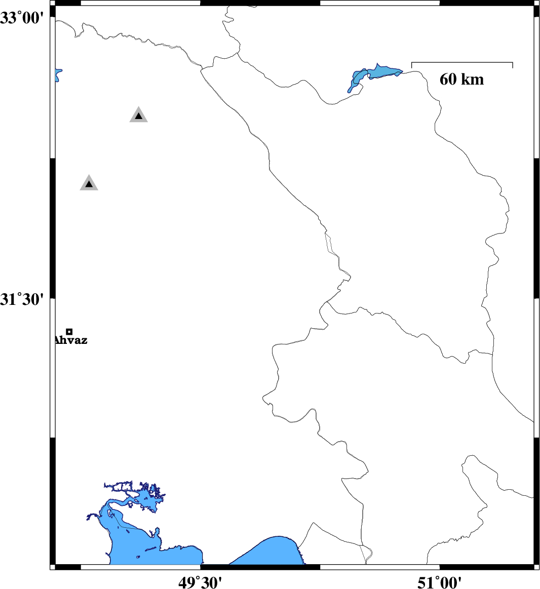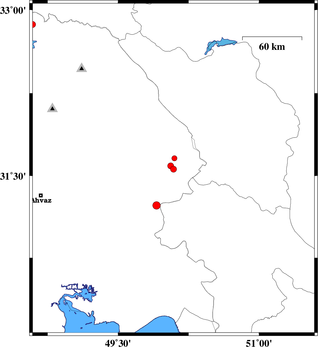 | 2014/04/11 | 07:17:38.2 | 11:47:38.2 | 32.87 | 48.59 | 29 | ML2.9 | Khoozestan Province, 51 km North-East of Andimeshk | ||