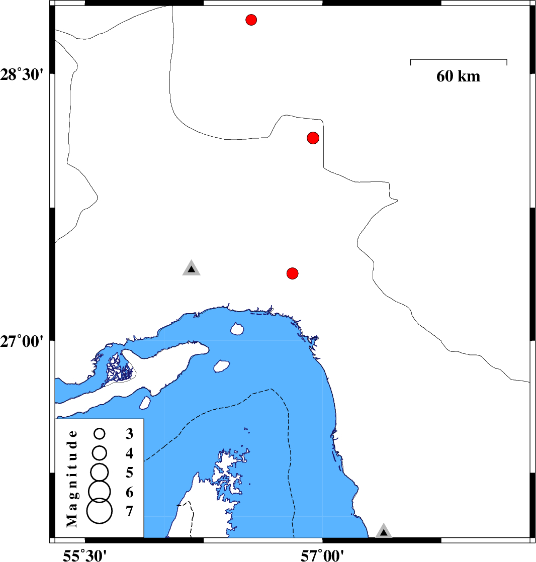 | 2014/04/12 | 06:02:18.9 | 10:32:18.9 | 27.38 | 56.81 | 15 | ML3.3 | Hormozgan Province, 43 km West of Dehbarez | ||