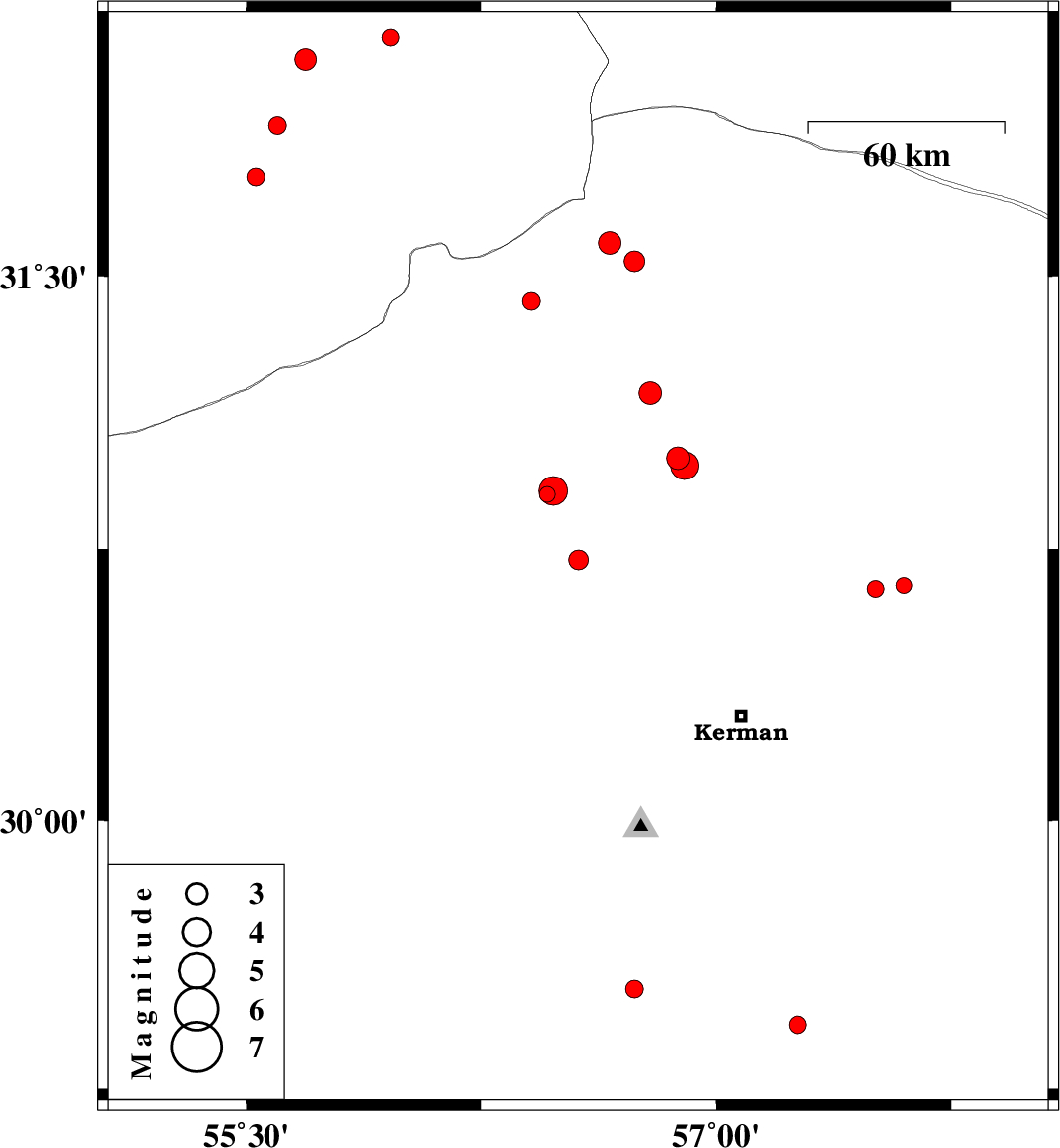 | 2014/04/11 | 23:36:13.3 | 04:06:13.3 | 30.98 | 56.9 | 14 | ML4 | Kerman Province, 33 km South of Ravar | ||