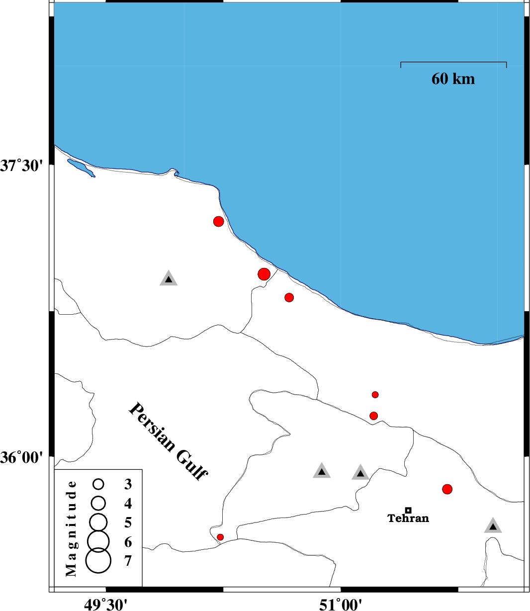 2014/03/20 | 11:13:22.5 | 14:43:22.5 | 36.94 | 50.51 | 31 | ML3.5 | Gilan Province, 13 km West of Ramsar | ||