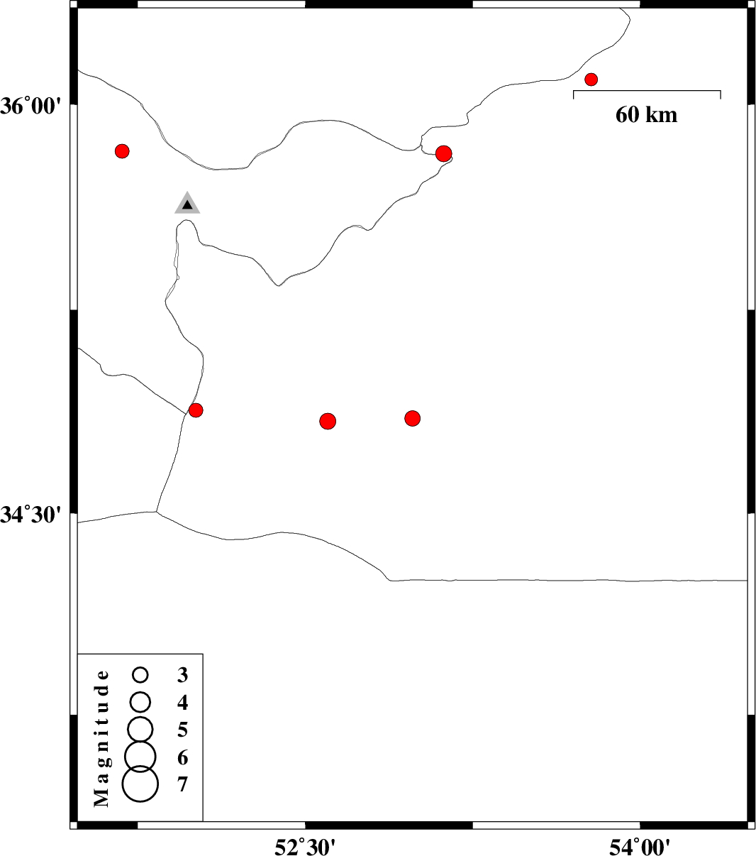 | 2014/04/14 | 15:45:14.1 | 20:15:14.1 | 34.88 | 52.01 | 29 | ML2.8 | Semnan Province, 48 km South-West of Garmsar | ||