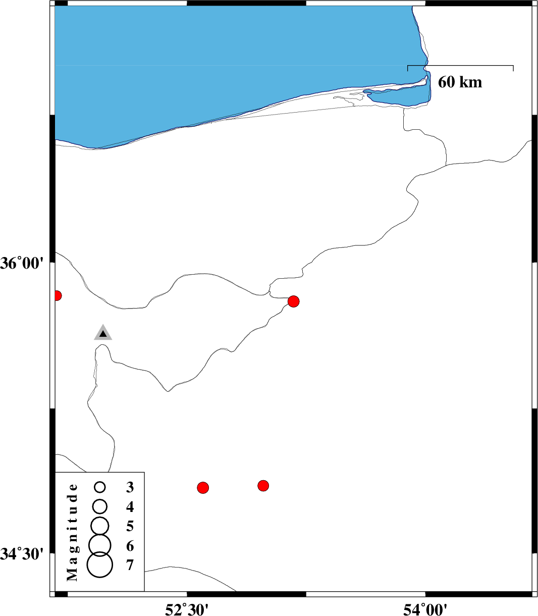 | 2014/04/14 | 15:45:14.1 | 20:15:14.1 | 34.88 | 52.01 | 29 | ML2.8 | Semnan Province, 48 km South-West of Garmsar | ||