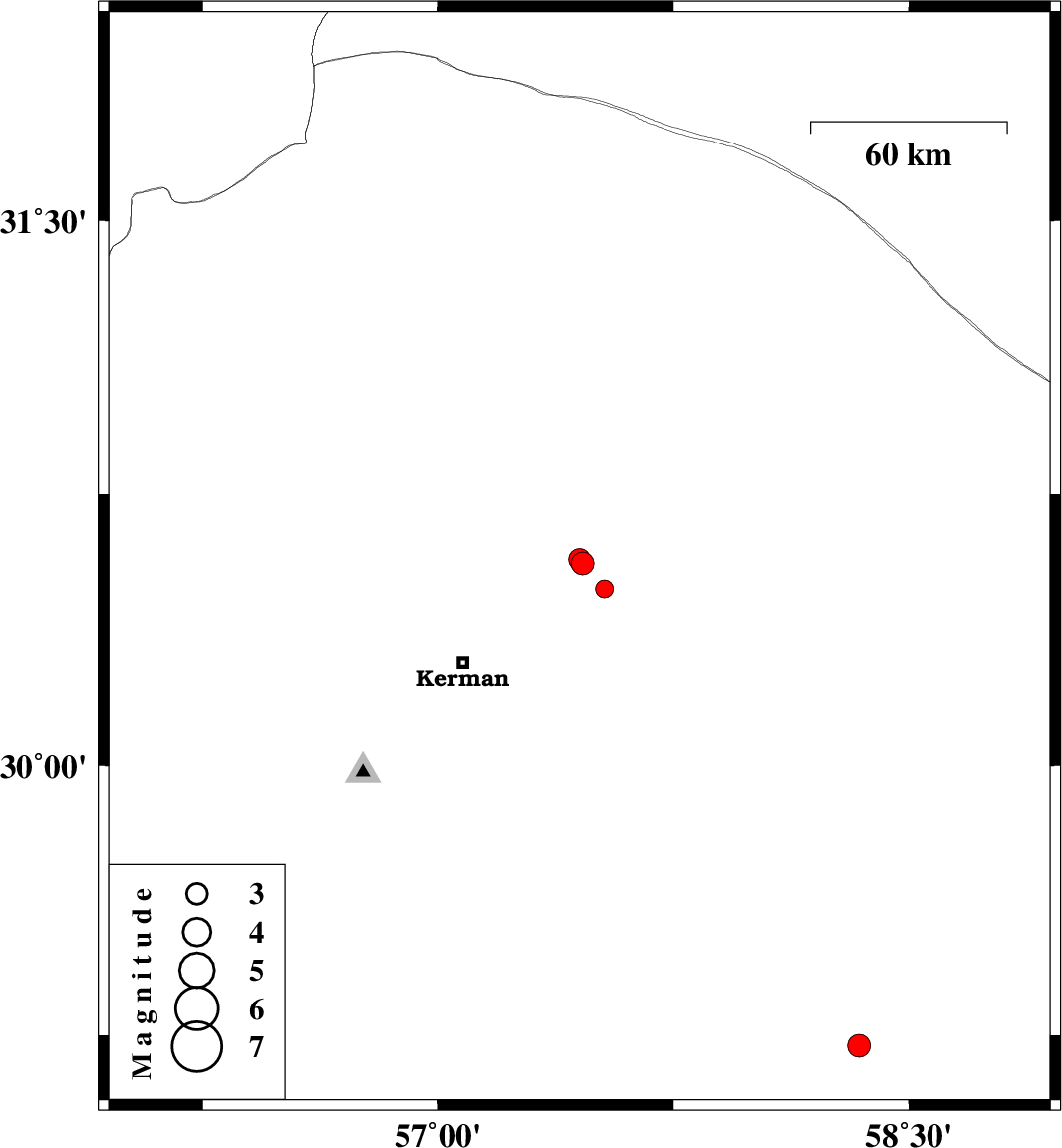 | 2014/04/23 | 11:15:41.9 | 15:45:41.9 | 30.57 | 57.45 | 14 | ML2.8 | Kerman Province, 47 km North-East of Kerman |