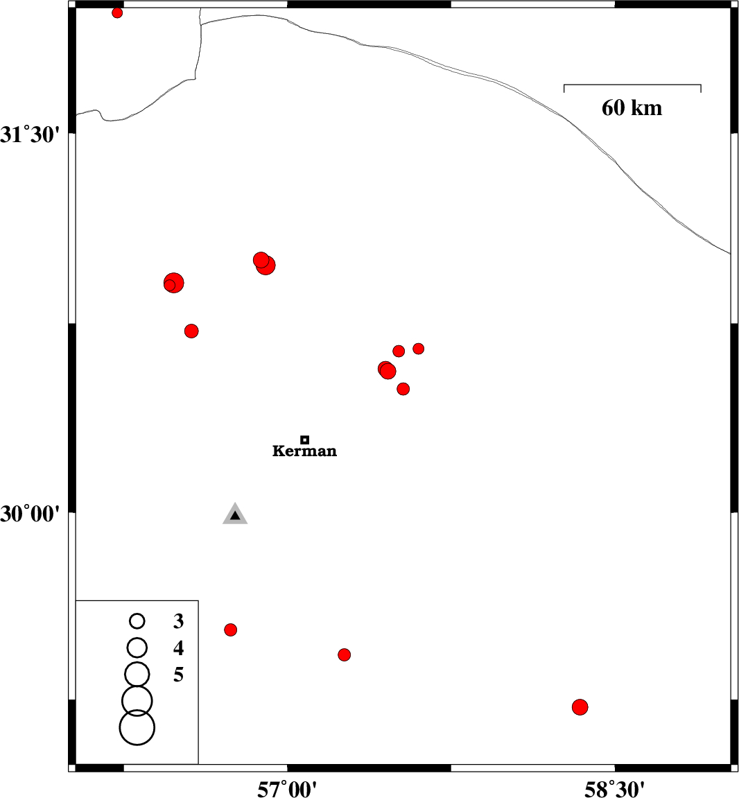 | 2014/03/30 | 06:45:38.8 | 11:15:38.8 | 29.53 | 56.74 | 12 | ML2.5 | Kerman Province, 35 km North-East of Baft |