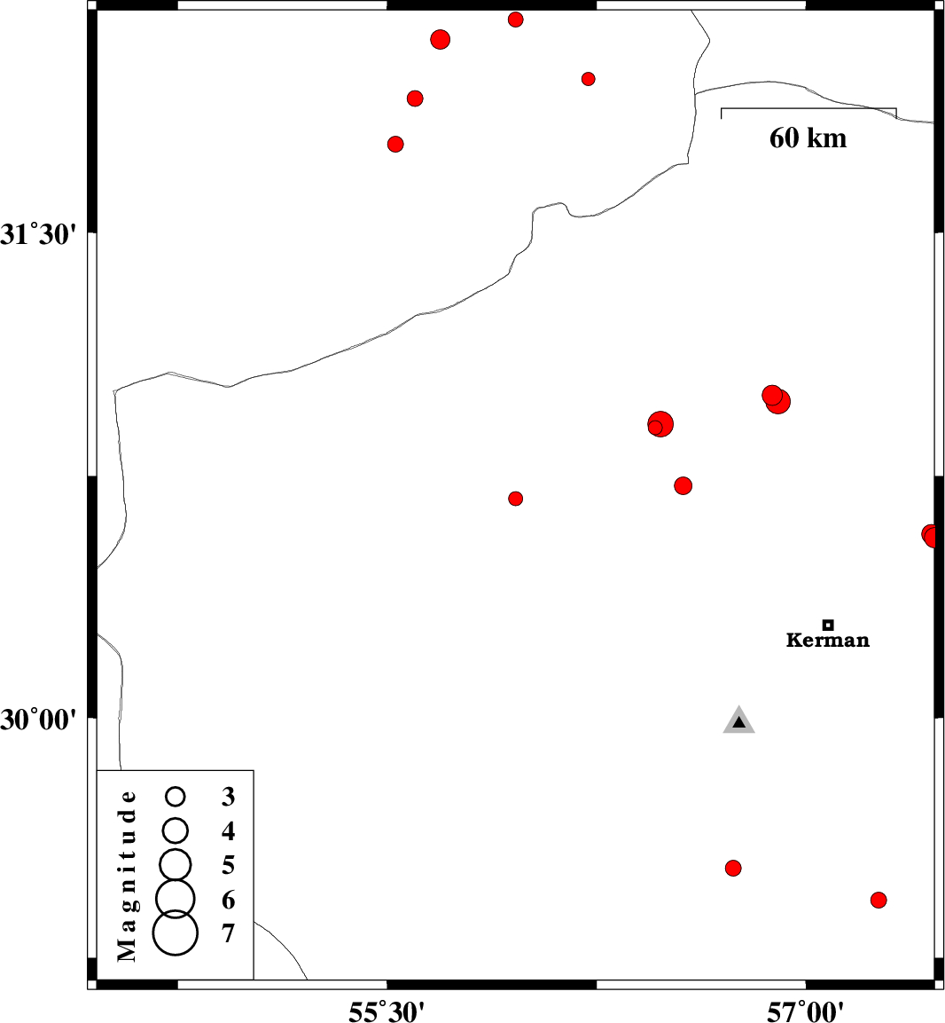 | 2014/03/30 | 06:45:38.8 | 11:15:38.8 | 29.53 | 56.74 | 12 | ML2.5 | Kerman Province, 35 km North-East of Baft |