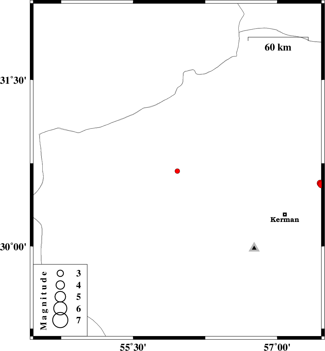 | 2014/04/23 | 11:15:41.9 | 15:45:41.9 | 30.57 | 57.45 | 14 | ML2.8 | Kerman Province, 47 km North-East of Kerman |