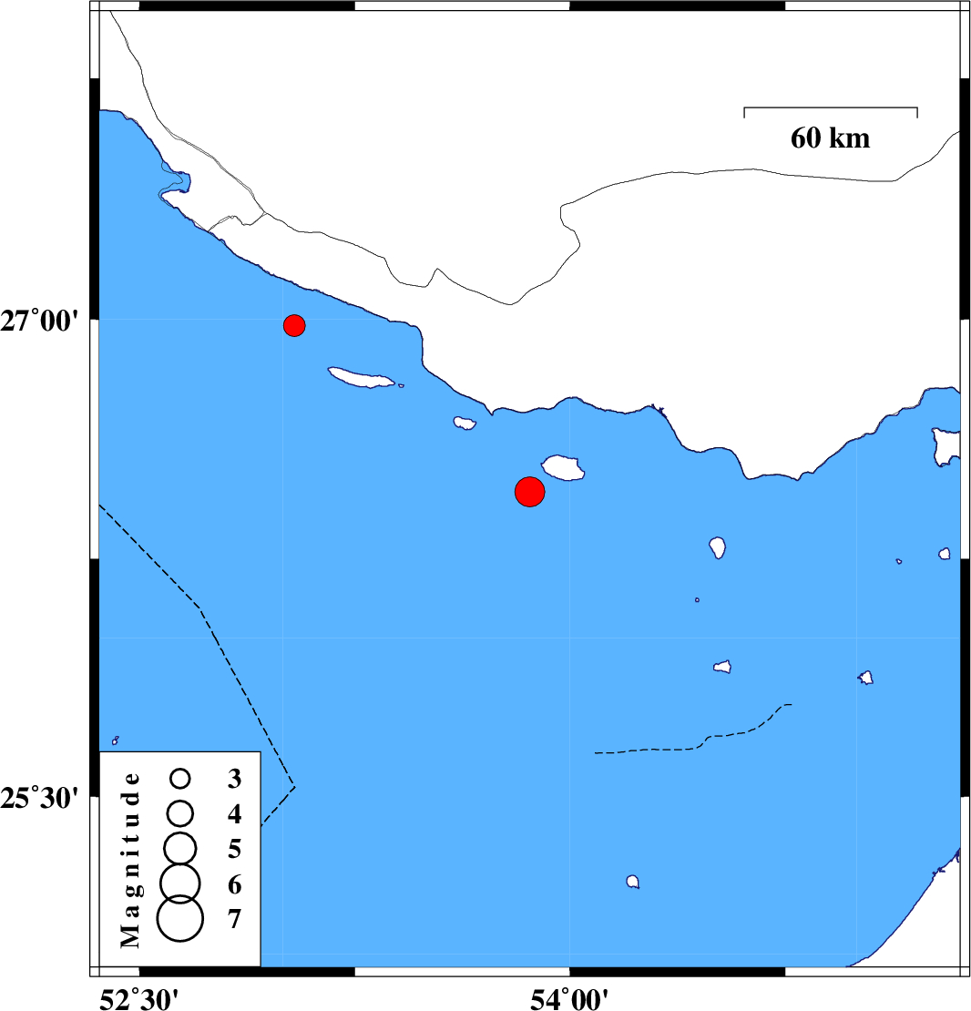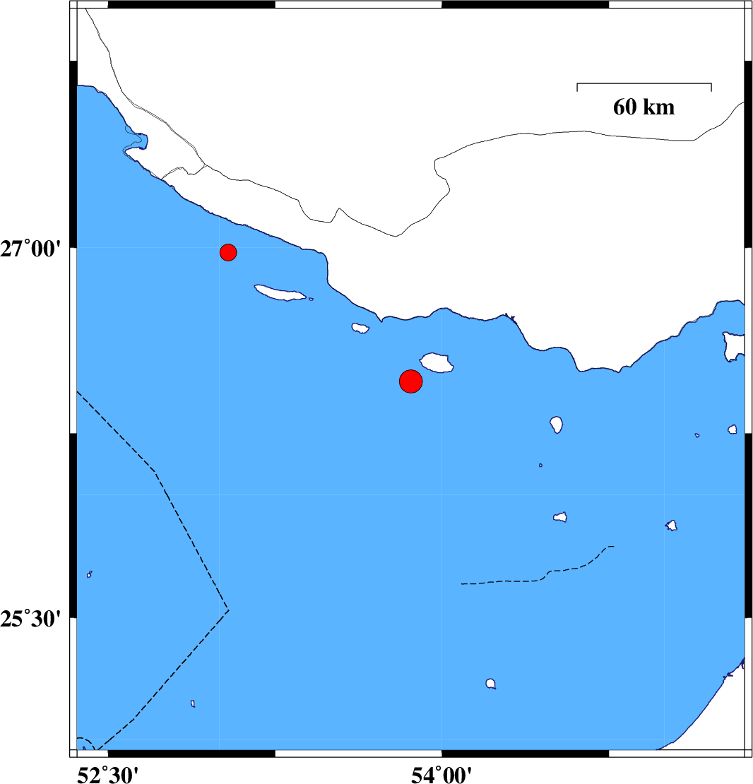 | 2014/04/12 | 22:09:32.0 | 02:39:32.0 | 26.98 | 53.04 | 18 | ML3.4 | Persian Gulf, 42 km South-West of Lamerd |