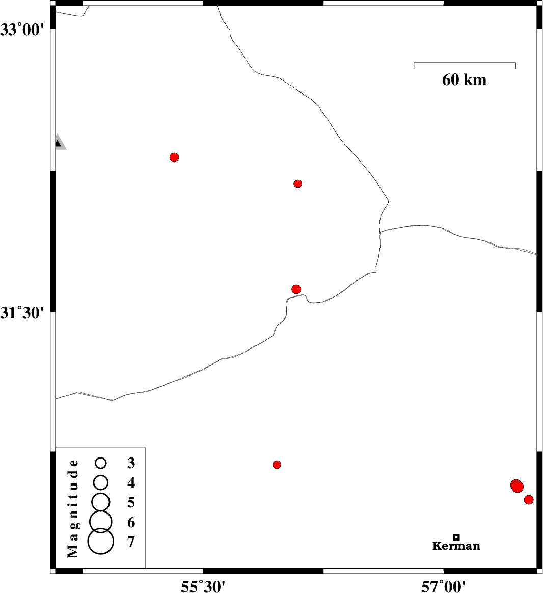 | 2014/04/24 | 01:45:07.6 | 06:15:07.6 | 30.49 | 57.53 | 16 | ML2.6 | Kerman Province, 49 km North-East of Kerman | ||