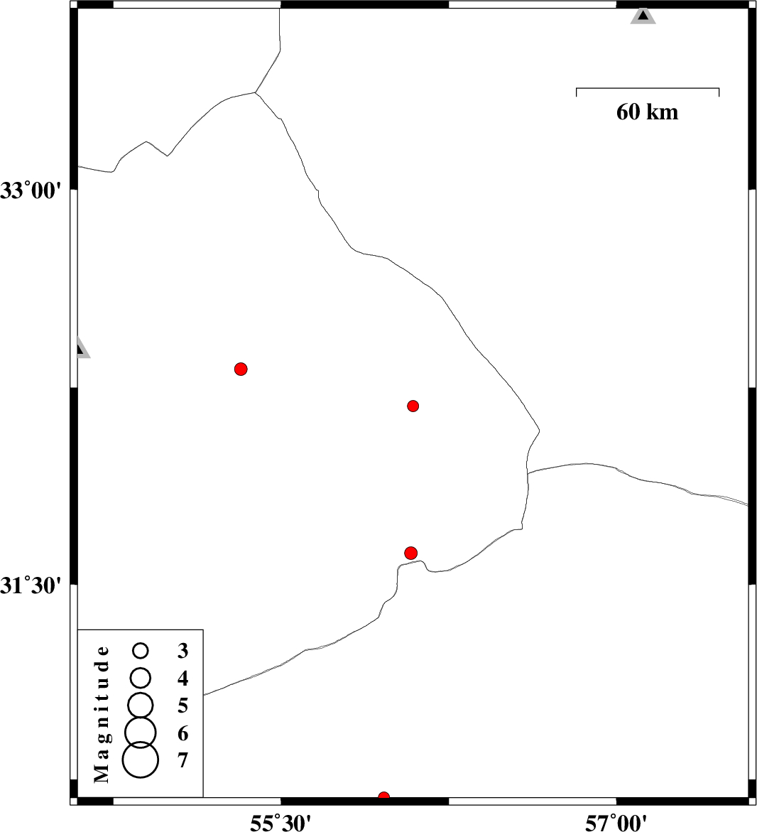 | 2014/04/25 | 00:30:11.3 | 05:00:11.3 | 30.68 | 55.96 | 14 | ML2.2 | Kerman Province, 31 km North of Rafsanjan | ||