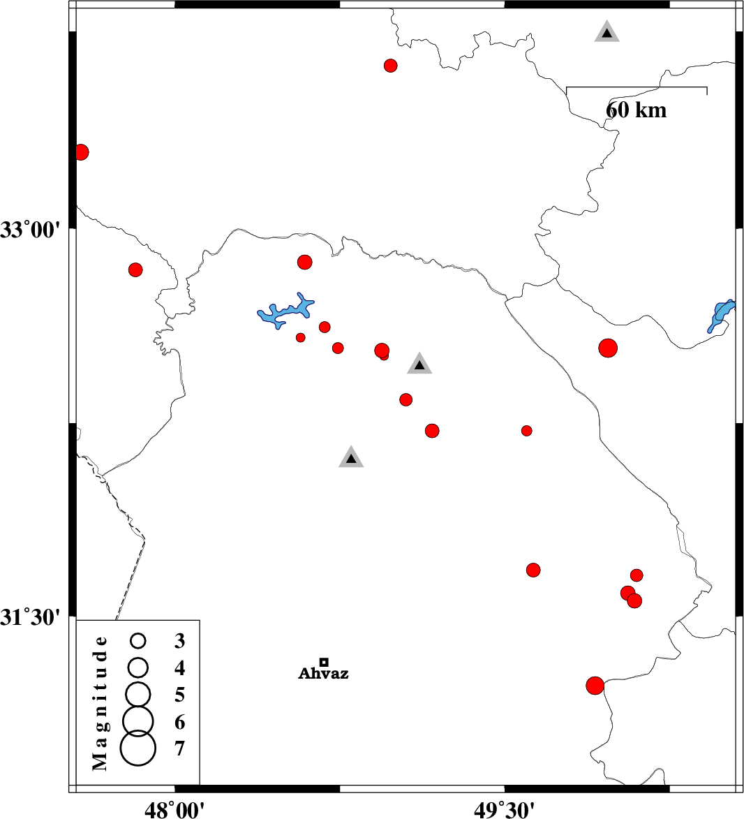 | 2014/03/29 | 21:52:09.1 | 02:22:09.1 | 32.62 | 48.68 | 15 | ML2.2 | Khoozestan Province, 36 km North-East of Andimeshk | ||