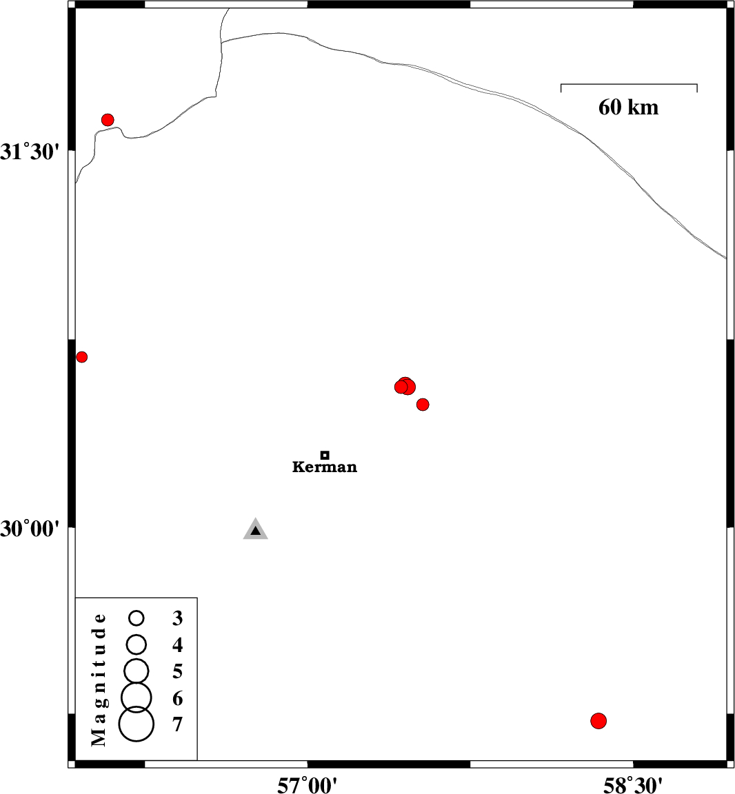 | 2014/04/23 | 11:15:41.9 | 15:45:41.9 | 30.57 | 57.45 | 14 | ML2.8 | Kerman Province, 47 km North-East of Kerman |