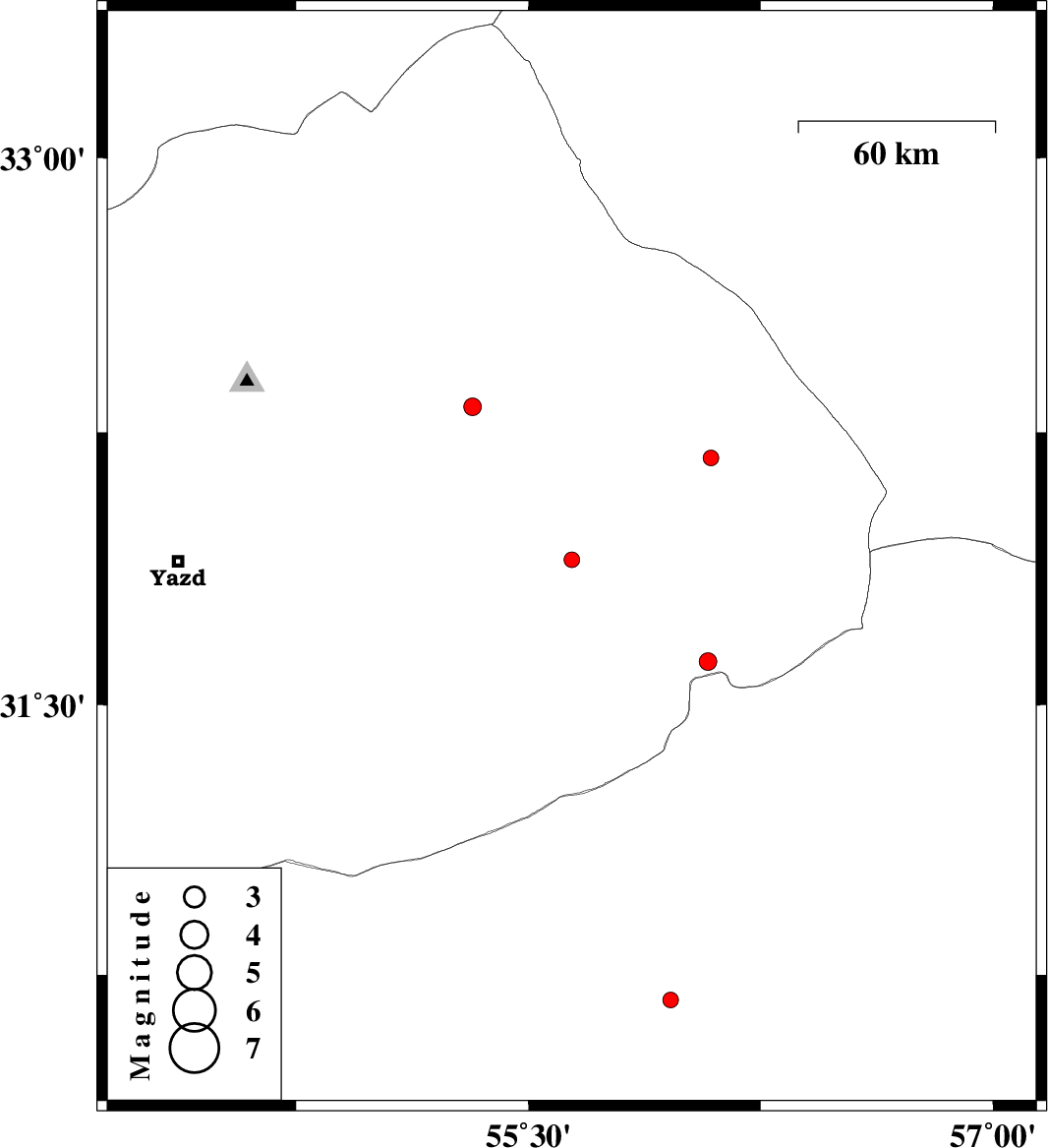 | 2014/04/21 | 21:26:44.0 | 01:56:44.0 | 32.32 | 55.32 | 18 | ML2.6 | Yazd Province, 80 km North of Bafq |