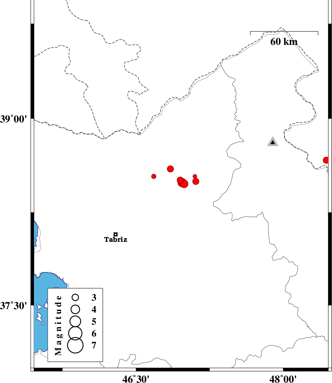2014/04/13 | 02:45:06.8 | 07:15:06.8 | 38.46 | 46.81 | 15 | ML3 | Azarbaijan Sharghi Province, 23 km West of Ahar | ||