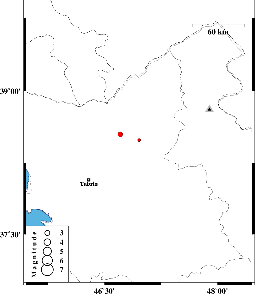 | 2014/04/29 | 01:44:53.4 | 06:14:53.4 | 38.49 | 46.96 | 6 | ML1.8 | Azarbaijan Sharghi Province, 10 km West of Ahar | ||