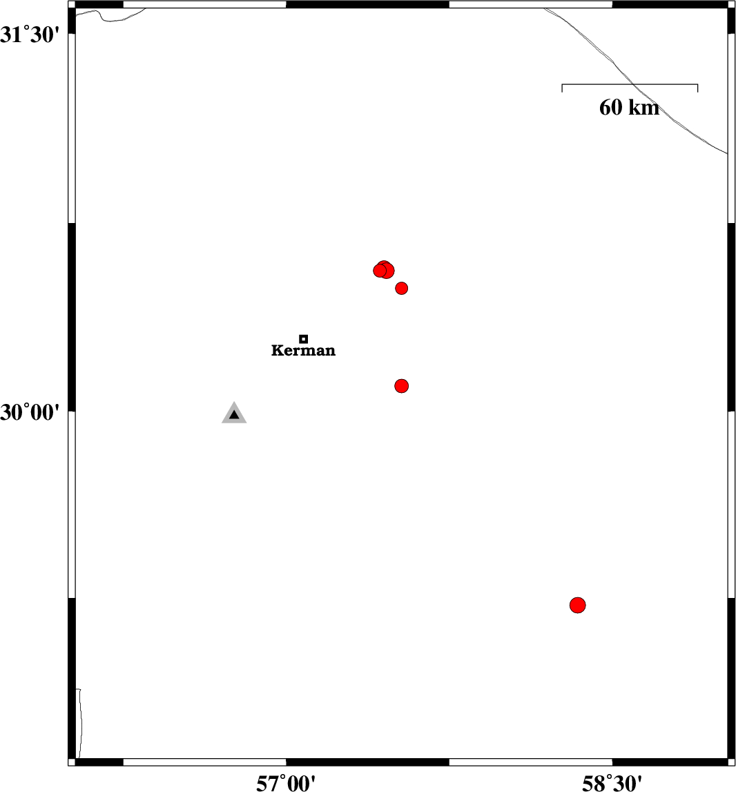 | 2014/04/23 | 11:15:41.9 | 15:45:41.9 | 30.57 | 57.45 | 14 | ML2.8 | Kerman Province, 47 km North-East of Kerman |