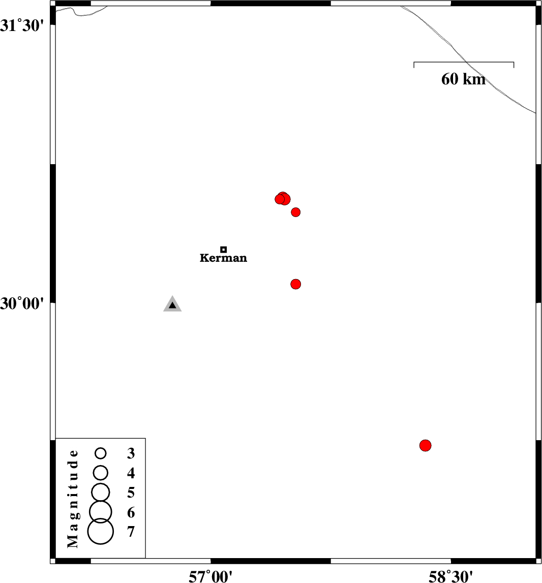 | 2014/04/29 | 04:57:59.3 | 09:27:59.3 | 30.1 | 57.53 | 18 | ML2.8 | Kerman Province, 48 km South-East of Kerman | ||
