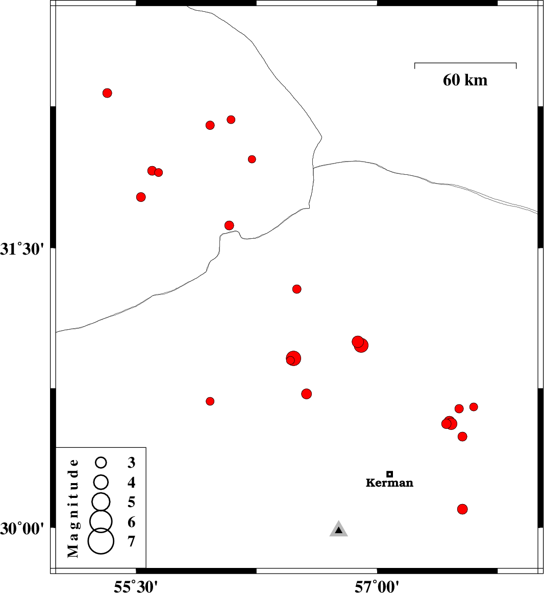 | 2014/04/29 | 04:57:59.3 | 09:27:59.3 | 30.1 | 57.53 | 18 | ML2.8 | Kerman Province, 48 km South-East of Kerman | ||
