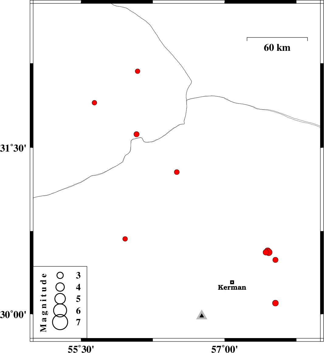 | 2014/04/24 | 01:29:09.6 | 05:59:09.6 | 30.57 | 57.45 | 15 | ML3.1 | Kerman Province, 48 km North-East of Kerman |