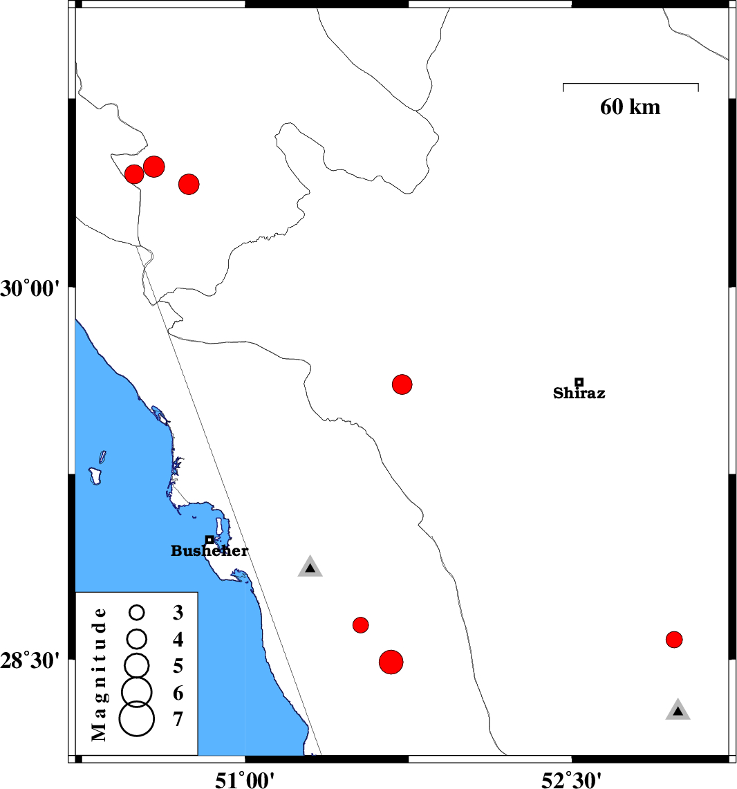 2014/04/16 | 23:31:37.3 | 04:01:37.3 | 28.49 | 51.67 | 11 | ML5 | Bushehr Province, 34 km South-East of Khormog |