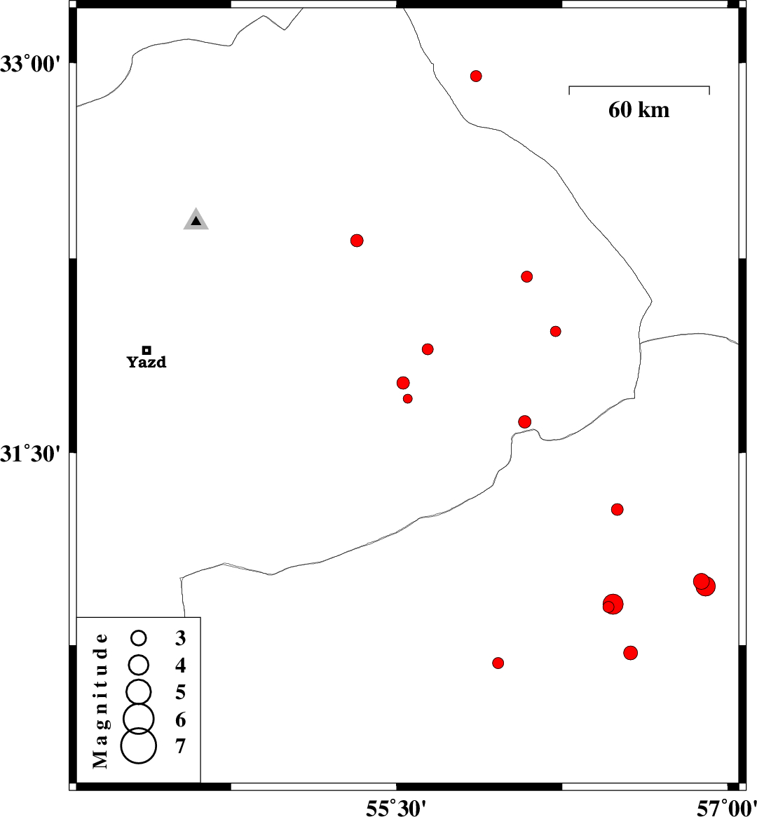 | 2014/05/05 | 18:19:31.3 | 22:49:31.3 | 32.95 | 55.86 | 14 | ML2.3 | Yazd Province, 123 km South-West of Tabas | ||