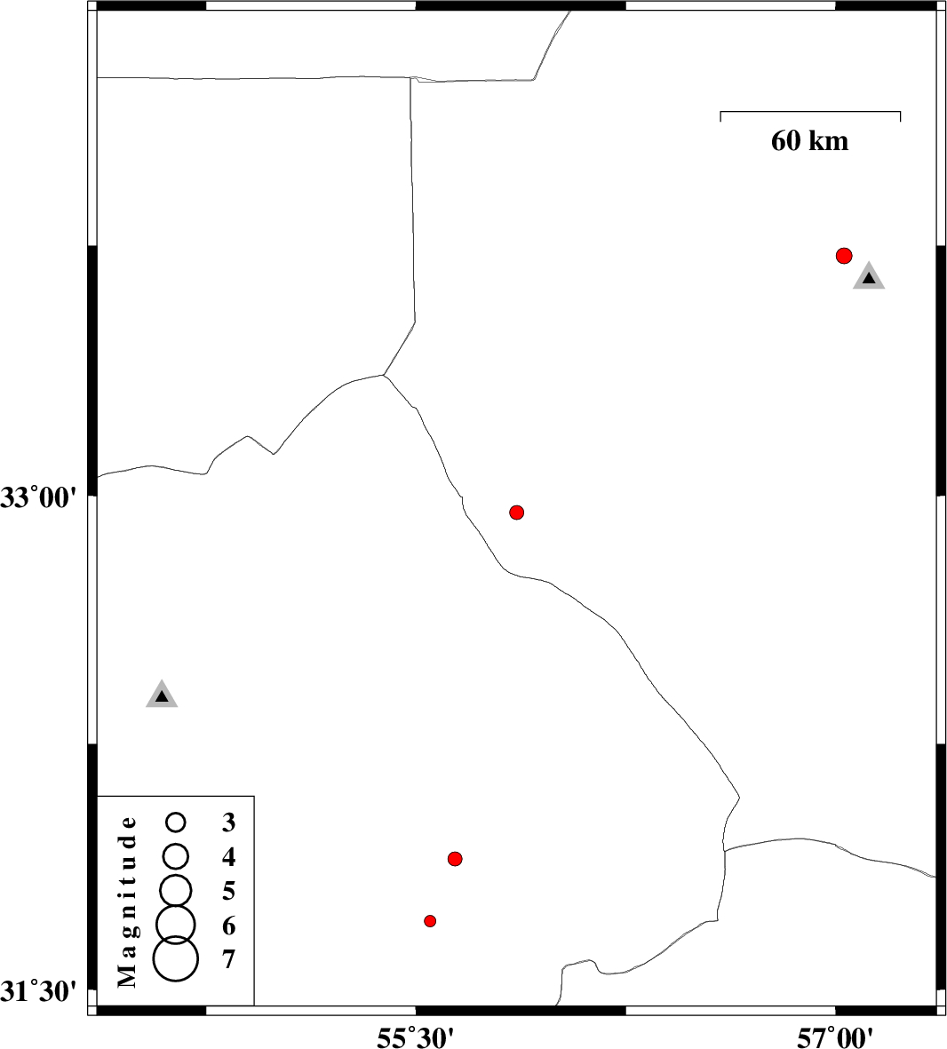 | 2014/04/28 | 11:56:21.1 | 16:26:21.1 | 31.9 | 55.64 | 36 | ML2.2 | Yazd Province, 41 km North-East of Bafq |
