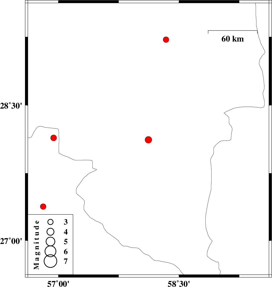 | 2014/05/06 | 13:28:23.0 | 17:58:23.0 | 28.12 | 58.12 | 16 | ML3.8 | Kerman Province, 46 km North-East of Kahnuj | ||