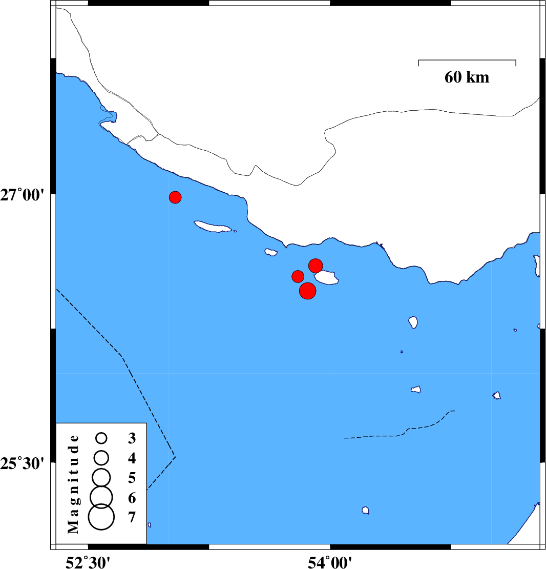 | 2014/04/29 | 11:31:09.5 | 16:01:09.5 | 26.6 | 53.91 | 14 | ML4 | Persian Gulf, 94 km West of Bandar-e lengeh | ||